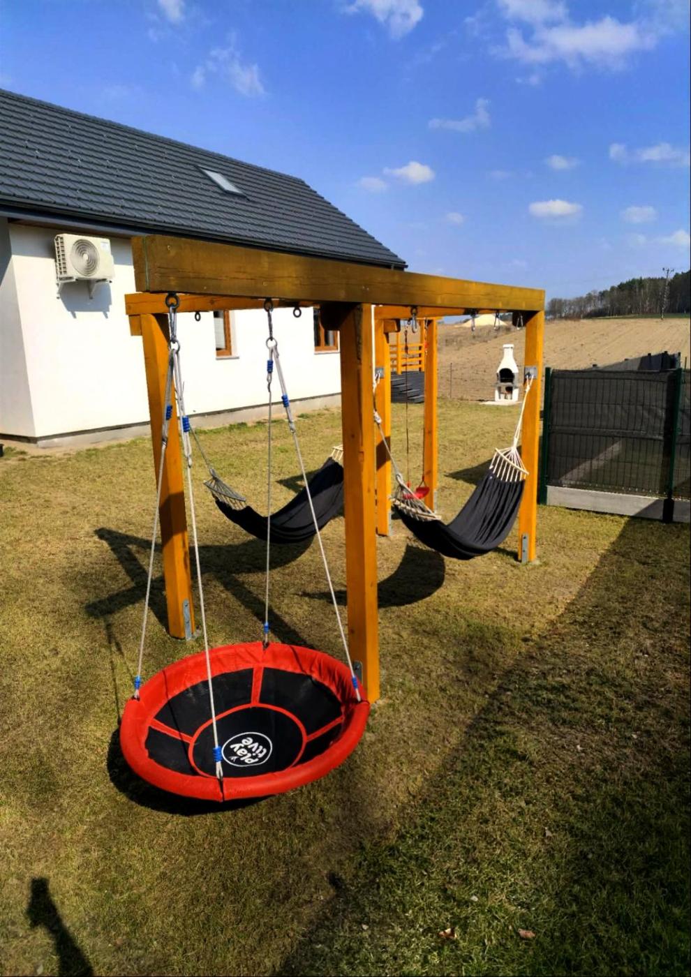 Dom z 2 sypialniami. The well-equipped kitchen has a stovetop, a refrigerator, a dishwasher and kitchenware. The holiday home features air conditioning, a washing machine, a terrace with garden views as well as a shared bathroom boasting a shower. The unit has 4 beds. Dom wakacyjny - 6 osobowy. Powierzchnia pokoju ok.: 65 mkw.